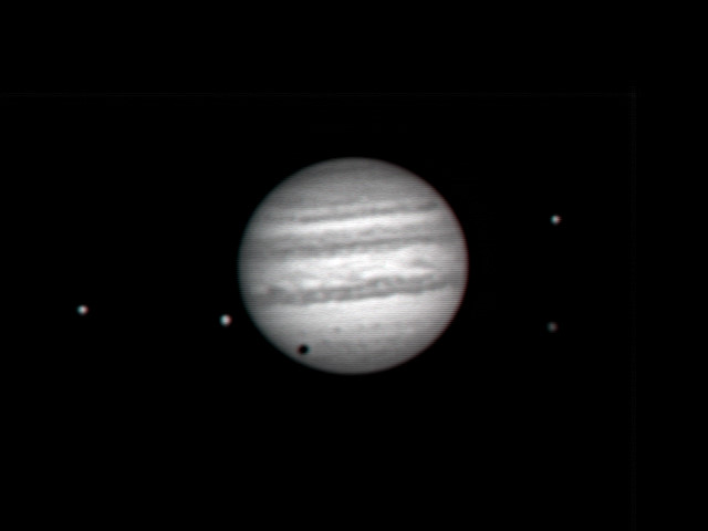 Left side moons are IO & Ganymede Shadow is from Callisto Left side top to bottom moons are Callisto & Europa Taken with SMAS CGE 1400, AstroVid video camera Processed with ImagesPlus 3.80 |