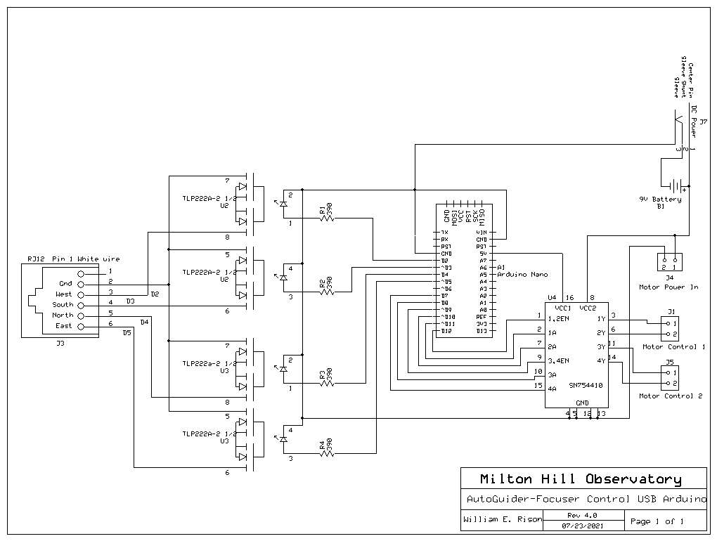 that uses the Arduino Nano to control a ST4 type AutoGuider port of any telescope mount. It also