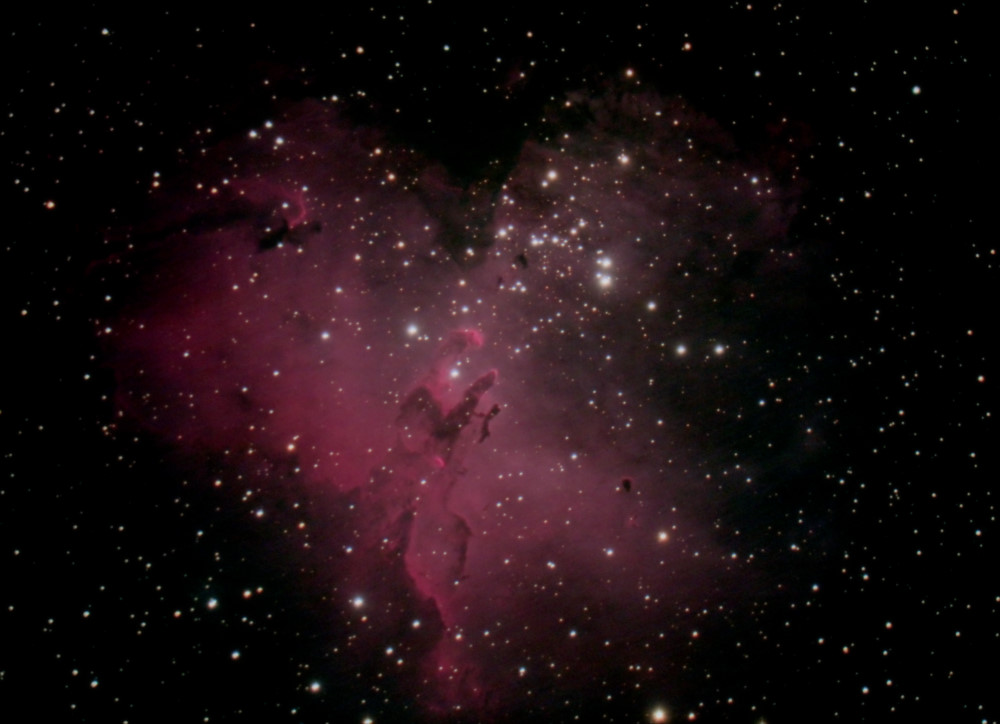 Telescope: Borg 125SD Lens: William Optics FLAT4 at 0.8x reducer/flattener set at 0 Mount: AP 900 GTO Camera: Canon 60Da ISO 400, 800, 1600 Exposure: 30 total, 10 at each ISO setting Processing: ImagesPlus 6.5 Location: NCO seeing poor Date: 30-Jan-2016 |
