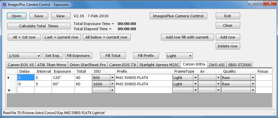 ImagesPlus Camera Control - Camera Exposures File Editor